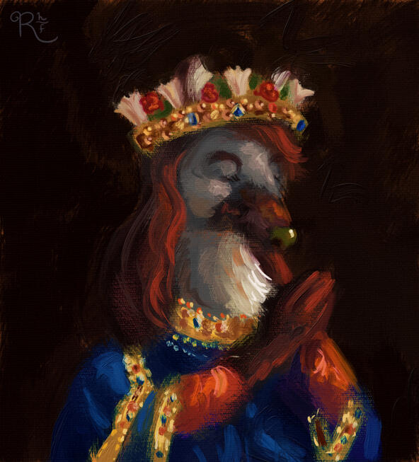 Digital picture of a character. These are flat coloured with textured lineart, and a complex painted background can be added for an additional $10. These are offered as busts, halfbodies, and full-bodies, and can depict the character in clothing pre-1910.