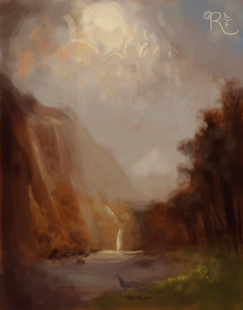 A fully digitally painted scene that focuses more on the environment that the character is placed in, rather than the character. These take the most time and effort, and therefore are the most expensive of the digital commissions.